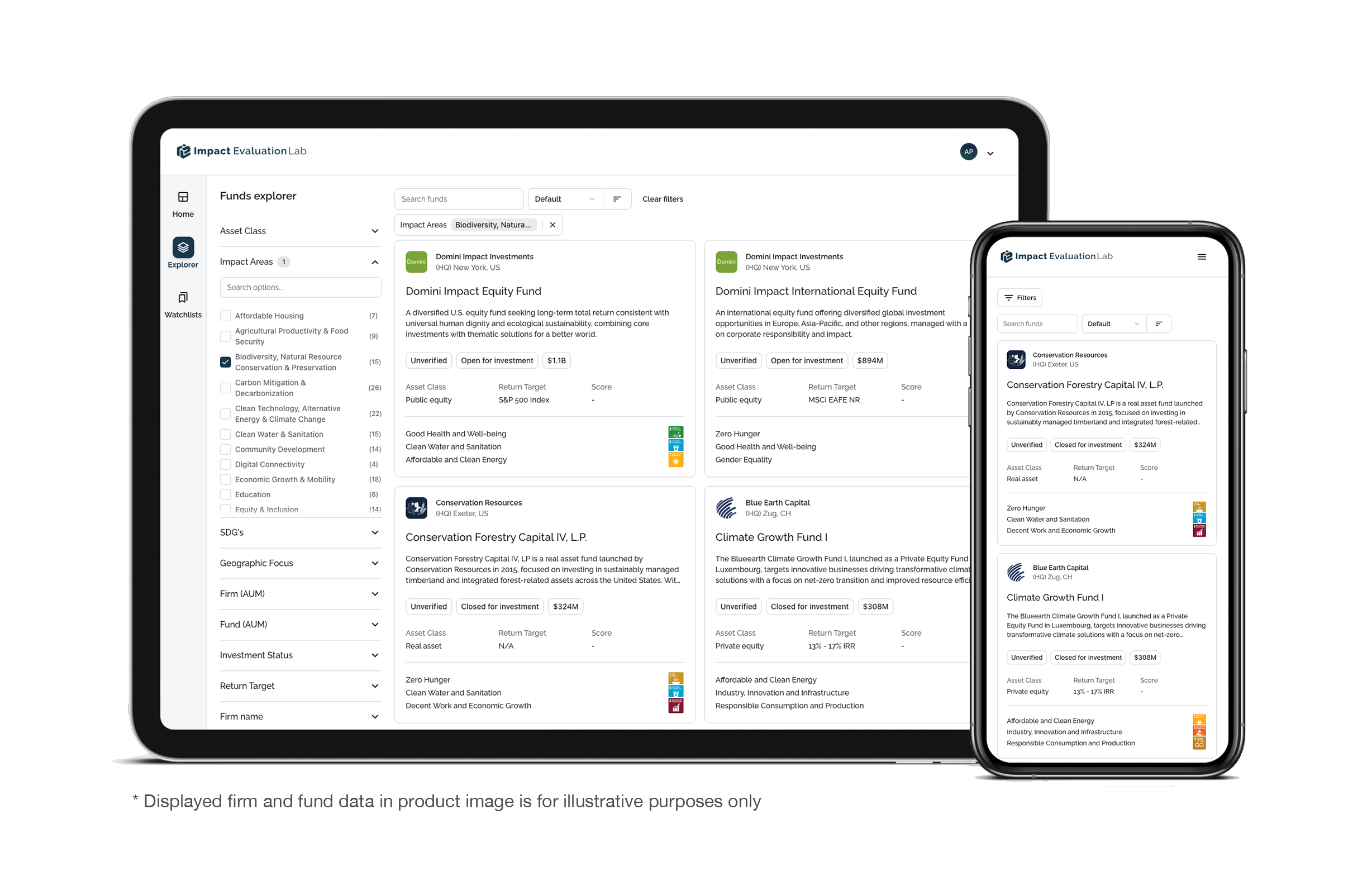 Assessed funds and the firms behind them are featured in the Impact Navigator Database. Investors can filter funds across 12 different impact dimensions allowing them to identify the funds that best match their objectives. Each Fund also includes,
